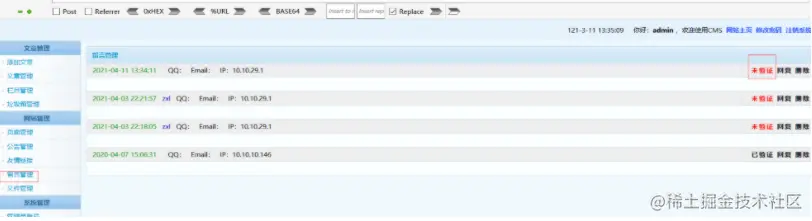 6,后我们登录后台,点击留言管理,再点击未验证(账号:admin,密码:123456)