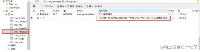 2、存储型XSS:又叫特久型XSS,直接将HTTP请求中的用户可控数据存储至数据库中,再从数据库中读取出来输出到HTML页面上,由于数据经过存储,可以持续被读取,攻击影响面和危害都较高
