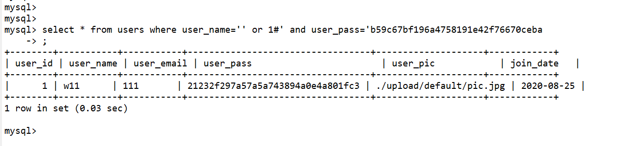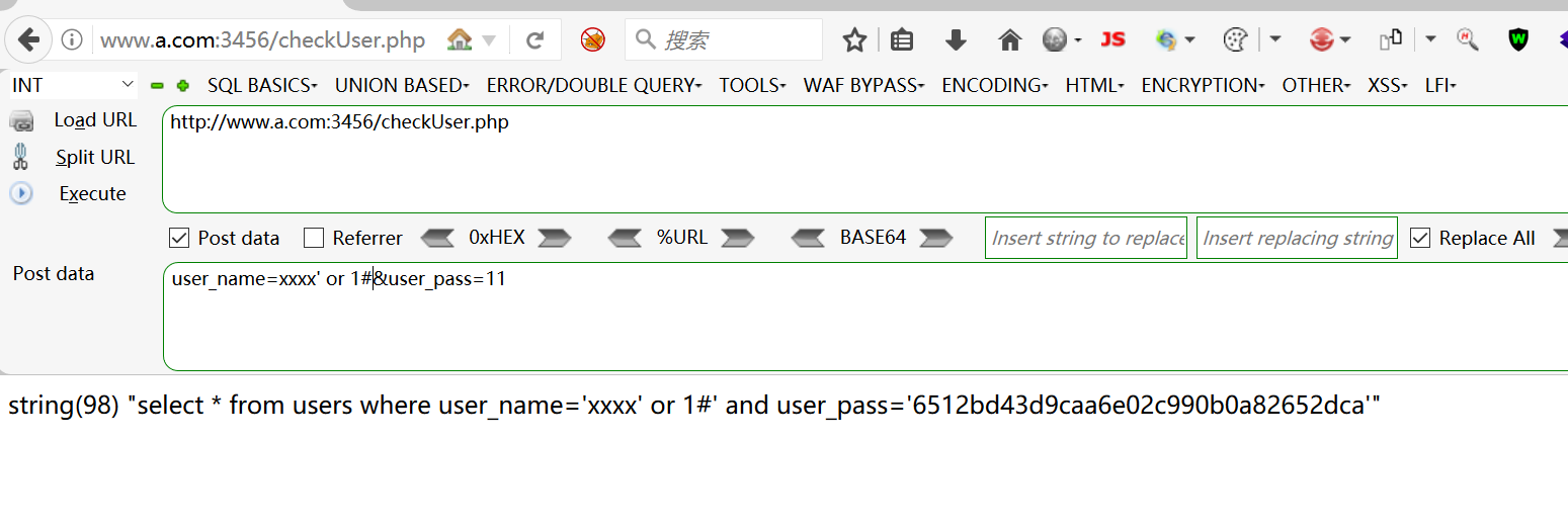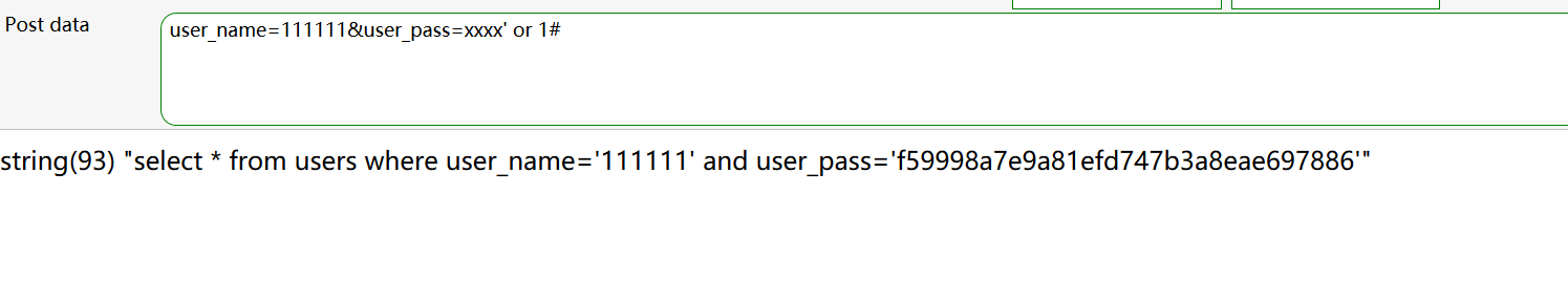 string(98) “select * from users where user\_name=’xxxx’ or 1#’ and user\_pass=’6512bd43d9caa6e02c990b0a82652dca’”