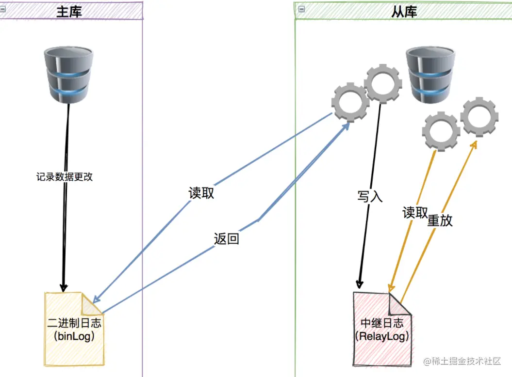 - 从库将主库上的日志复制到自己的中继日志(Relay Log)中。