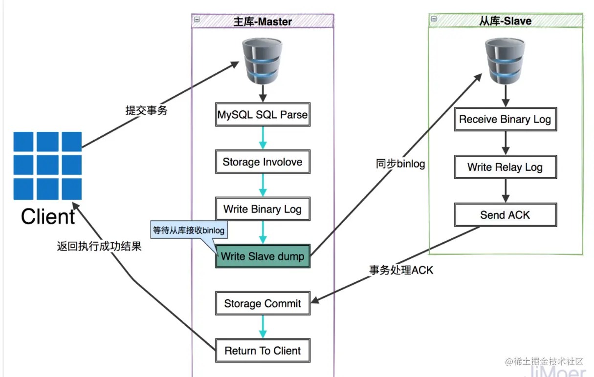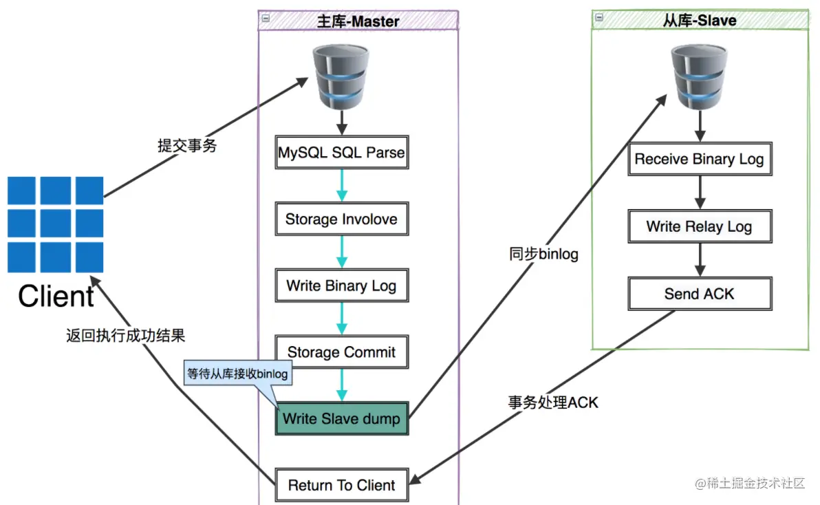 为了解决上面的隐患,MySQL从5.7版本开始,增加了一种新的半同步方式,新的半同步方式的执行过程是将“Storage Commit”这一步移动到了“Write Slave dump”后面。