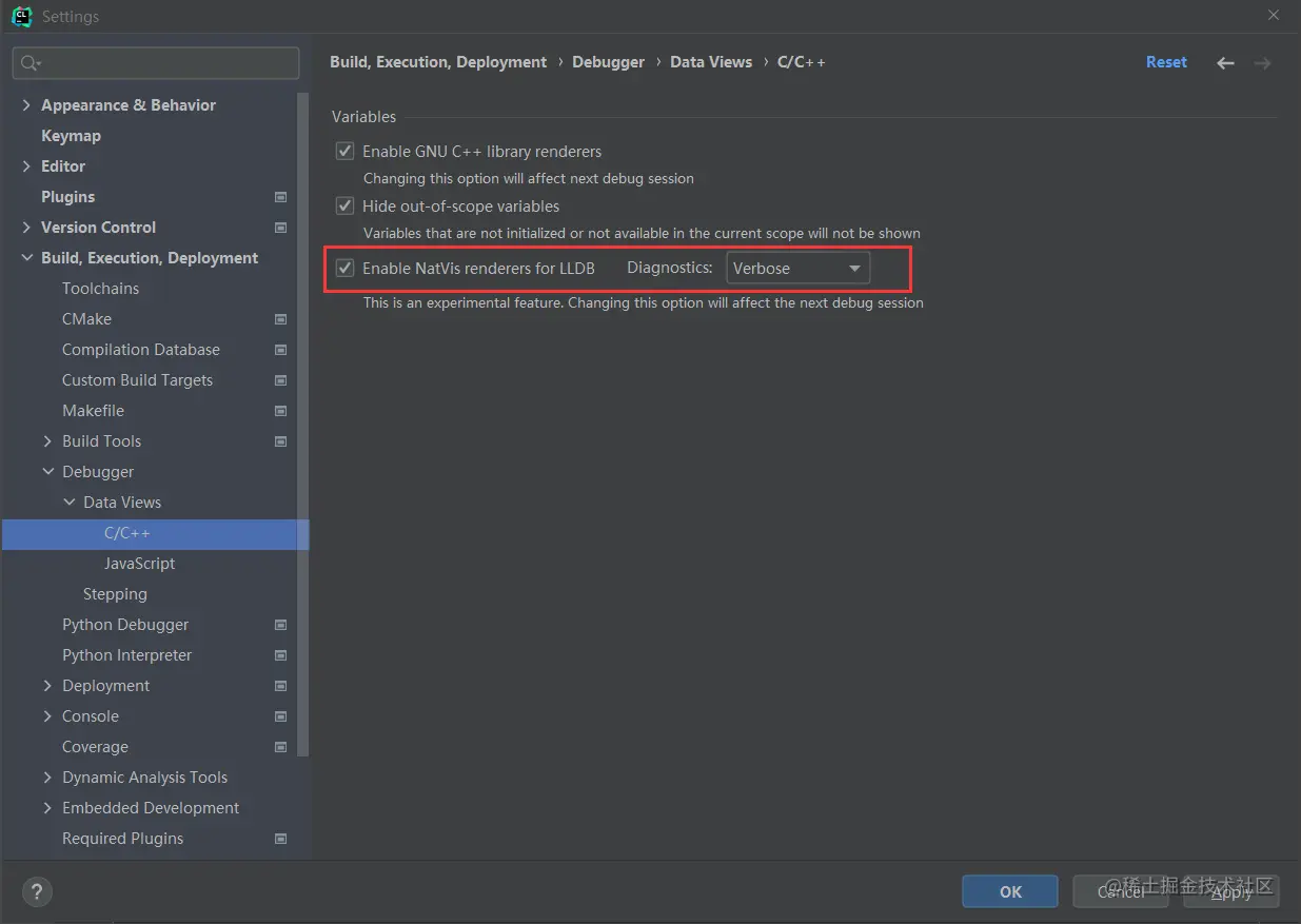 找到Enable NatVis renderes for LLDB Diagnostics 选择 Verbose,如下图所示