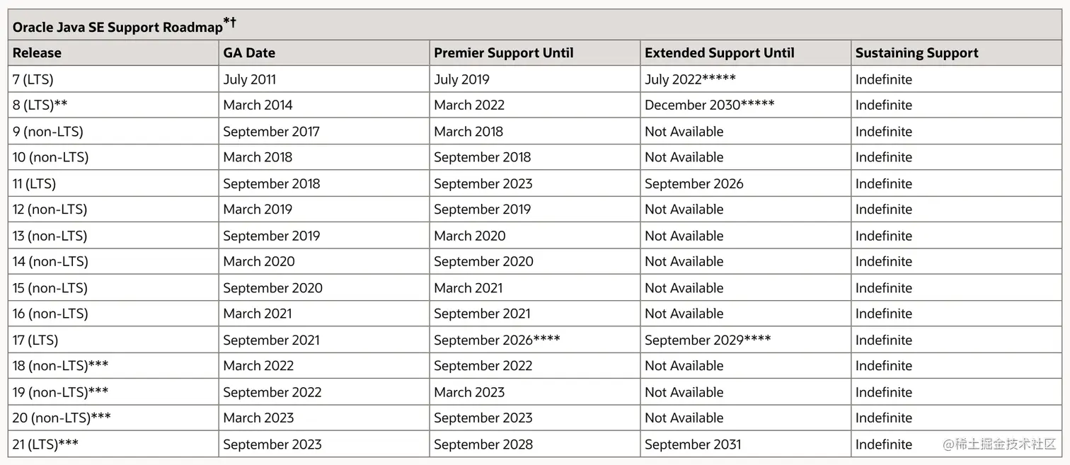 上面这张图是 Oracle 官方给出的 Oracle JDK 支持的时间线。可以看得到,JDK 17 最多可以支持到 2029 年 9 月份,长达 8 年!