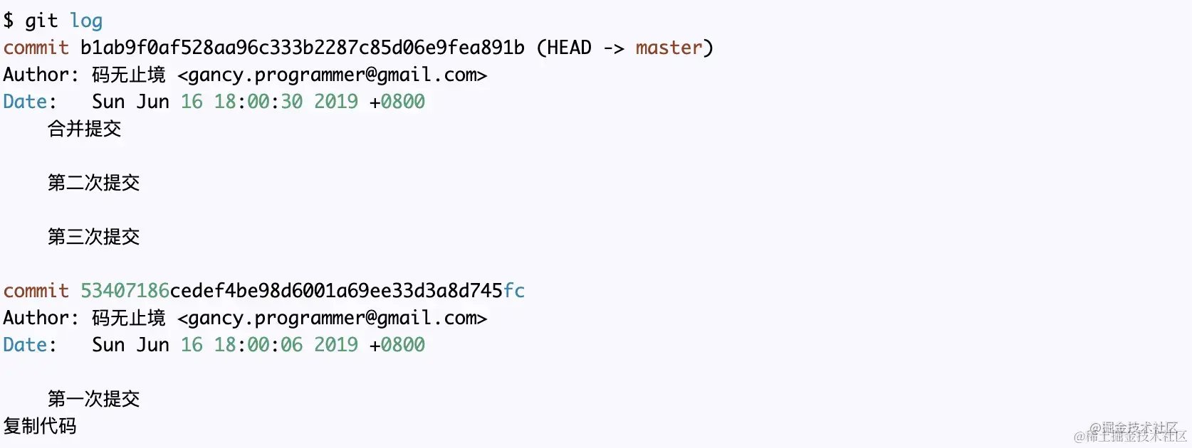 这里我们做通过git log可以看到我们的三次提交,通过使用git rebase命令将后两个提交合并成一个commit: