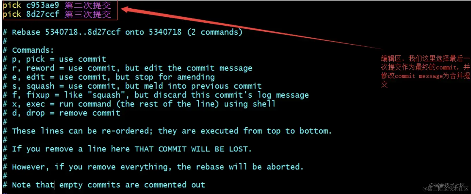 首先执行git rebase -i HEAD2,这里的HEAD2表明的合并最近两次提交,命令执行后会进入到一个vi编辑页面,以下所示: