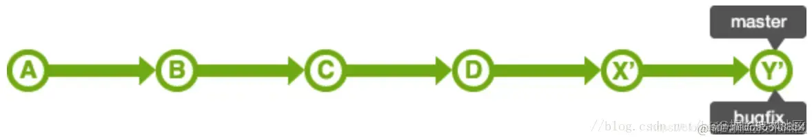 - 首先,rebase bugfix 分支到 master 分支, bugfix 分支的历史记录会添加在 master 分支的后面。如图所示,历史记录成一条线,相当整洁。