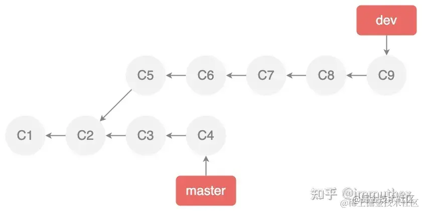 如下有两个分支master和dev,从C2开始两个分支开始有不同的commits。