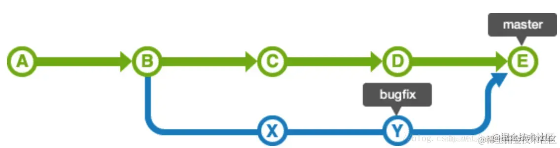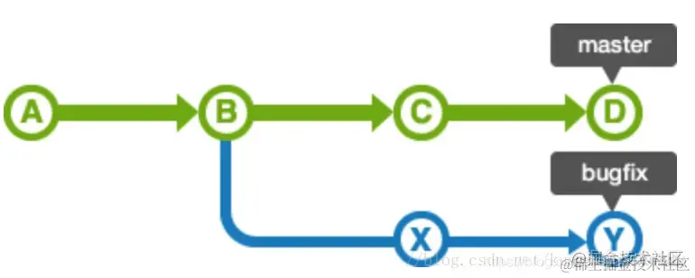 如下图所示,bugfix 分支是从 master 分支分叉出来的。