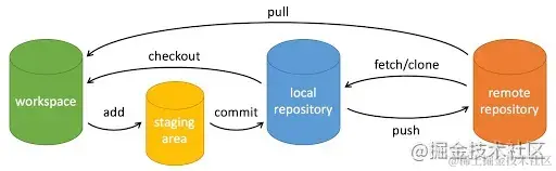 **暂存区:**英文叫 stage 或 index。一般存放在 .git 目录下的 index 文件(.git/index)中,所以我们把暂存区有时也叫作索引(index)。