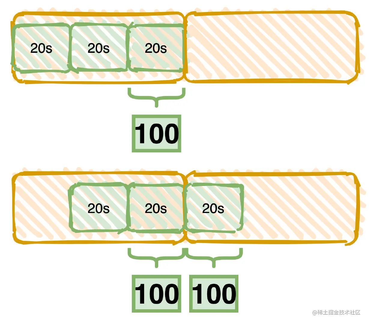然后时间窗口滑动,下一个20s请求又来了100个请求,此时我们滑动窗口的60s范围内请求数量肯定就超过100了啊,所以请求被拒绝。