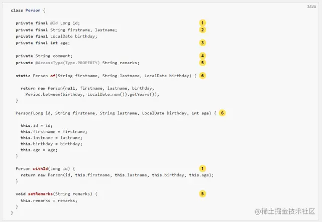 该age属性是不可变的,但从该属性派生birthday。使用所示设计,数据库值将胜过默认值,因为 Spring Data 使用唯一声明的构造函数。即使意图是计算应该是首选,重要的是此构造函数也将age作为参数(可能会忽略它),否则属性填充步骤将尝试设置年龄字段并由于它不可变且没有with…方法而失败在场。