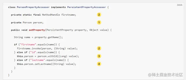 与我们在对象构造中的优化类似,我们也使用 Spring Data 运行时生成的访问器类与实体实例进行交互。
