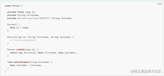 identifier 属性是最终的,但null在构造函数中设置为。该类公开了一个withId(…)用于设置标识符的方法,例如,当一个实例插入到数据存储中并生成一个标识符时。Person创建新实例时,原始实例保持不变。相同的模式通常应用于由存储管理但可能必须为持久性操作更改的其他属性。wither 方法是可选的,因为持久性构造函数(参见 6)实际上是一个复制构造函数,并且设置该属性将被转换为创建一个应用新标识符值的新实例。