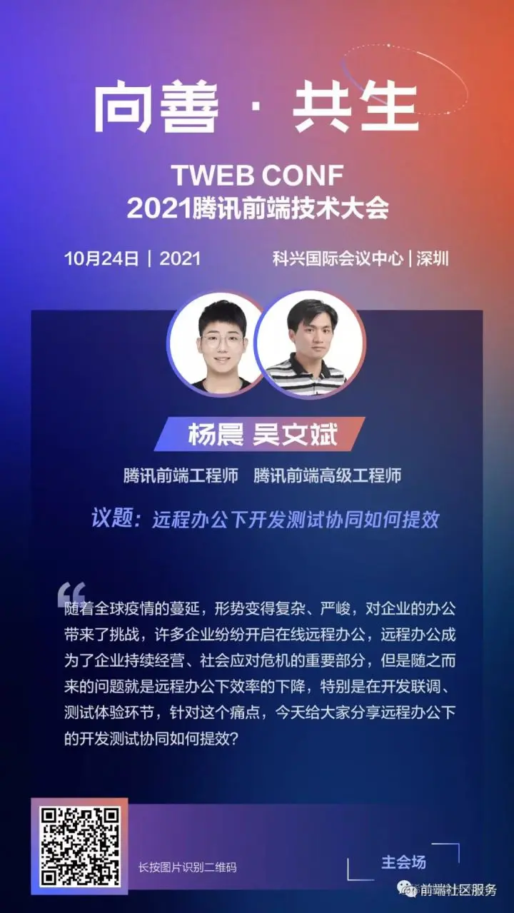 两年间发生了许多事,彻底改变了我们的生活。全国抗疫,河南救灾,在这些牵动你我的事件背后,都涌现了许多广泛传播的互联网产品——拯救生命的腾讯文档,支撑中小企业复工复产的腾讯会议,协助师生复课的腾讯课堂等等,这些优秀的互联网产品背后,都闪现了腾讯前端工程师的许多技术智慧。