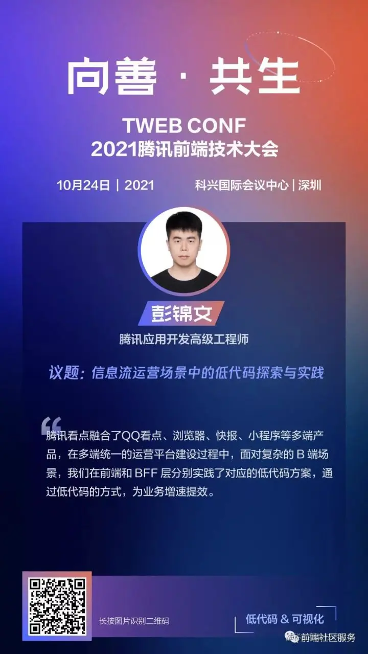 本会场会先由腾讯视频、腾讯云、腾讯看点的三位专家,分别带来管理平台和Web/小程序应用搭建的三套解决方案。视频与看点的方案更侧重低代码的编辑器,腾讯云则更侧重于Serverless在低代码平台上的串联。