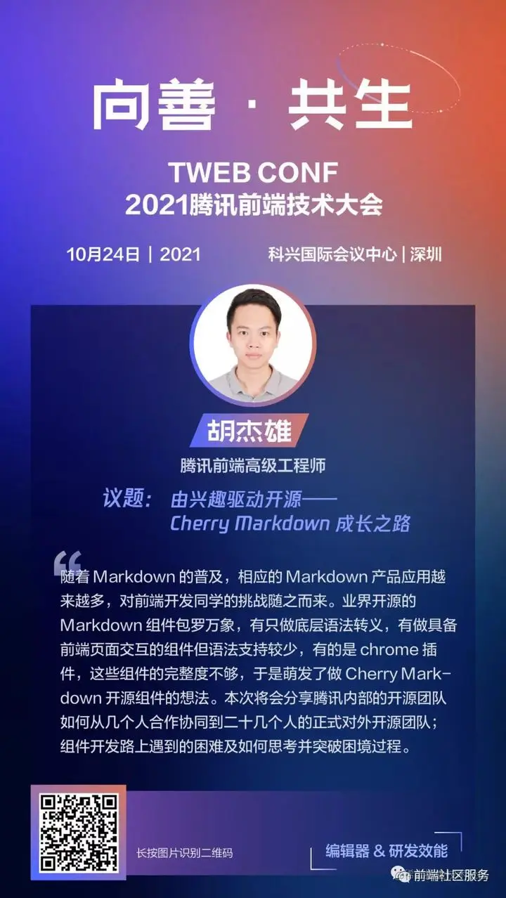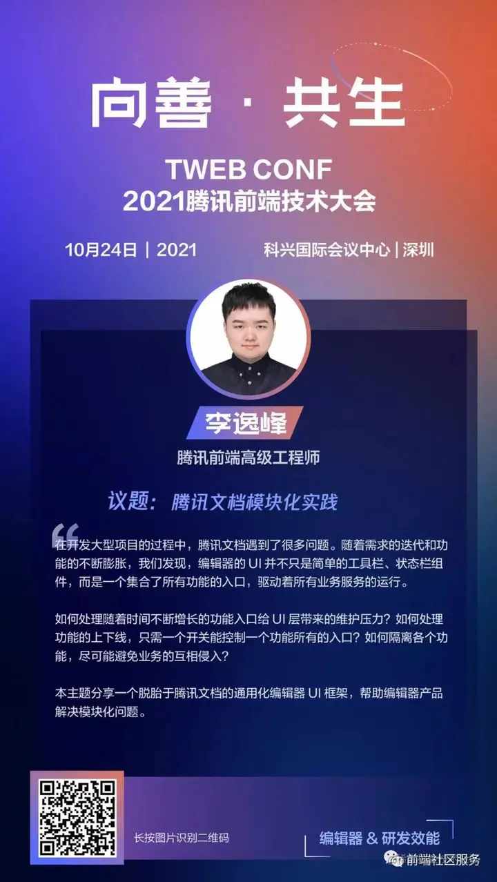 作为前端领域中的复杂应用场景之一,编辑器的开发会遇到怎样的难题,又是如何解决的?本次大会分别邀请到腾讯TEG、腾讯文档和稿定科技的三位专家,从MarkDown、文档编辑器、多媒体编辑器三种场景,介绍在编辑器实现路上如何披荆斩棘,克服工程化、协作、性能等各方面挑战。