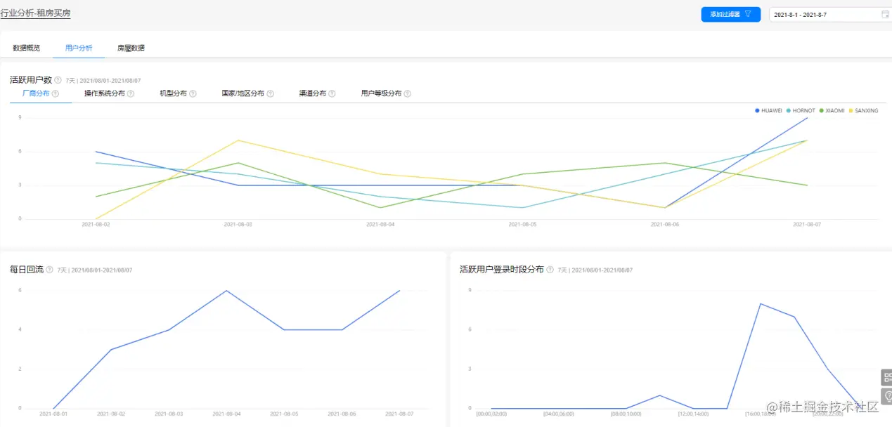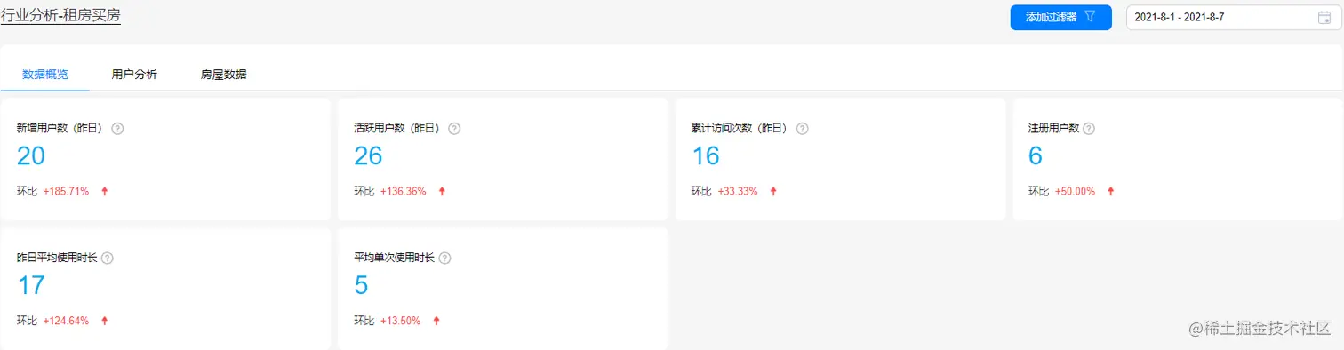 数据概览看板呈现了昨日新增用户数、昨日活跃用户数、昨日平均使用时长等互联网房产服务行业运营人员最为关注的应用整体用户走势趋向,让当前应用的整体运营现状一目了然。