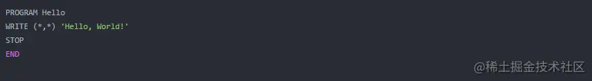Fortran编程语言是Formula Translation的派生。它是一种汇编命令式程序设计语言,特别适合于数值计算和科学计算。Fortran语言创建于1957年,用这种语言写的“Hello, World!”: