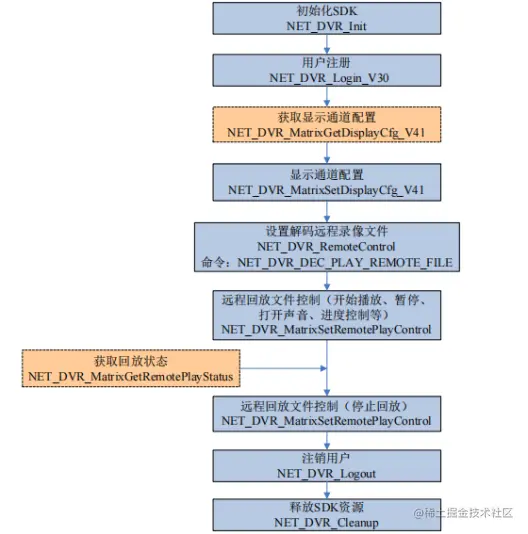 设置解码远程录像文件:首先通过 NET_DVR_RemoteControl(命令:NET_DVR_DEC_PLAY_REMOTE_FILE),设置按时间或者按文件名回放远程设备的录像文件,然后调用 NET_DVR_MatrixSetRemotePlayControl 启动解码。