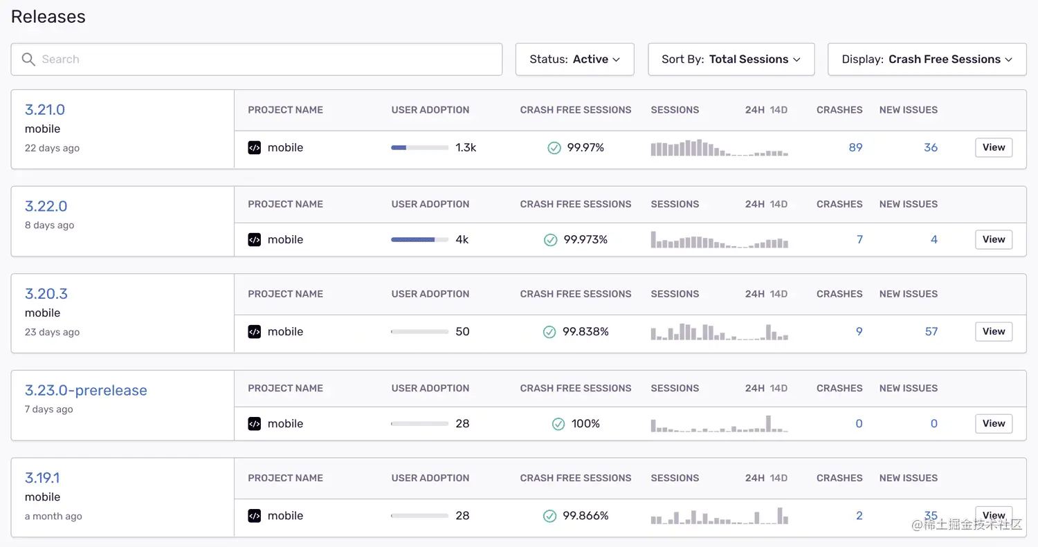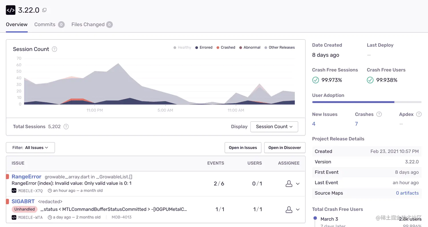 在谷歌编写的原始Dart SDK的基础上,我们扩展了功能,以报告设备和操作系统的细节、本地崩溃、会话数据和版本采用情况,因此开发人员可以快速确定一个版本是否成功,或者是否应该回滚。我们新的Flutter SDK使开发者能够轻松地对问题进行细分,以确定哪些用户采用了最新的版本或遇到了崩溃,或者在不太理想的情况下,两者都有。