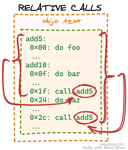 我们的玩具对象文件的问题是,两个函数都是用外部链接声明的--这是C语言中所有函数和全局变量的默认设置。而且,虽然两个函数都是在同一个文件中声明的,但编译器并不确定add5'代码在目标二进制文件中的最终位置。所以编译器避免做任何假设,不计算callq指令的相对偏移参数。让我们通过删除我们的猴子补丁并将add5函数声明为静态`来验证这一点。
