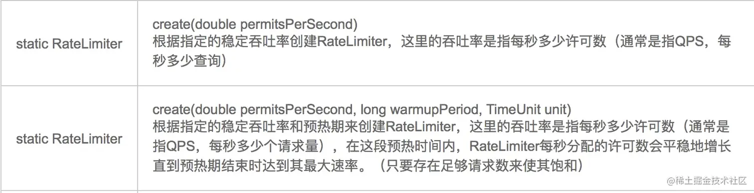 根据指定的稳定吞吐率创建RateLimiter,这里的吞吐率是指每秒多少许可数(通常是指QPS,每秒多少查询)。