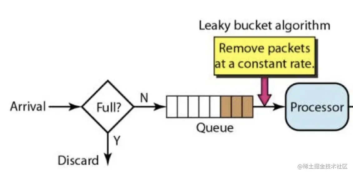 漏桶算法的实现往往依赖于队列,请求到达如果队列未满则直接放入队列,然后有一个处理器按照固定频率从队列头取出请求进行处理。如果请求量大,则会导致队列满,那么新来的请求就会被抛弃。