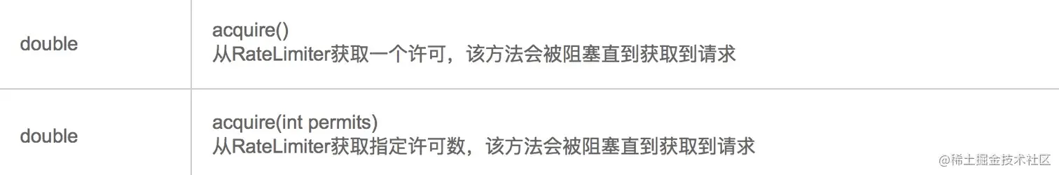 - RateLimiter从概念上来讲,速率限制器会在可配置的速率下分配许可证。如果必要的话,每个acquire() 会阻塞当前线程直到许可证可用后获取该许可证。一旦获取到许可证,不需要再释放许可证。