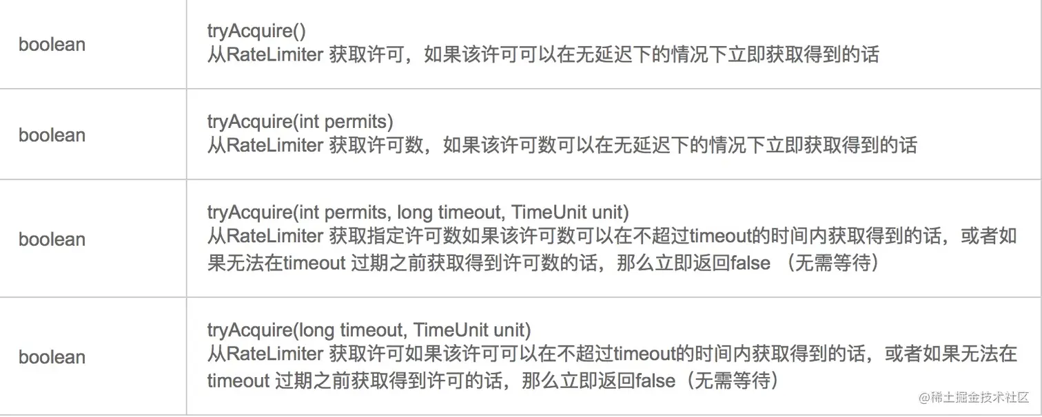 - 然后请求的时候,通过tryAcquire()方法向RateLimiter获取许可(令牌)。