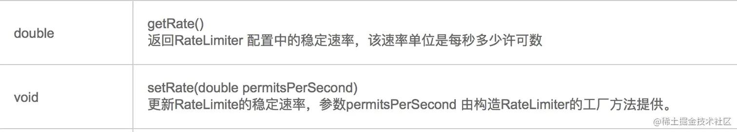 返回RateLimiter 配置中的稳定速率,该速率单位是每秒多少许可数。它的初始值相当于构造这个RateLimiter的工厂方法中的参数permitsPerSecond ,并且只有在调用setRate(double)后才会被更新。