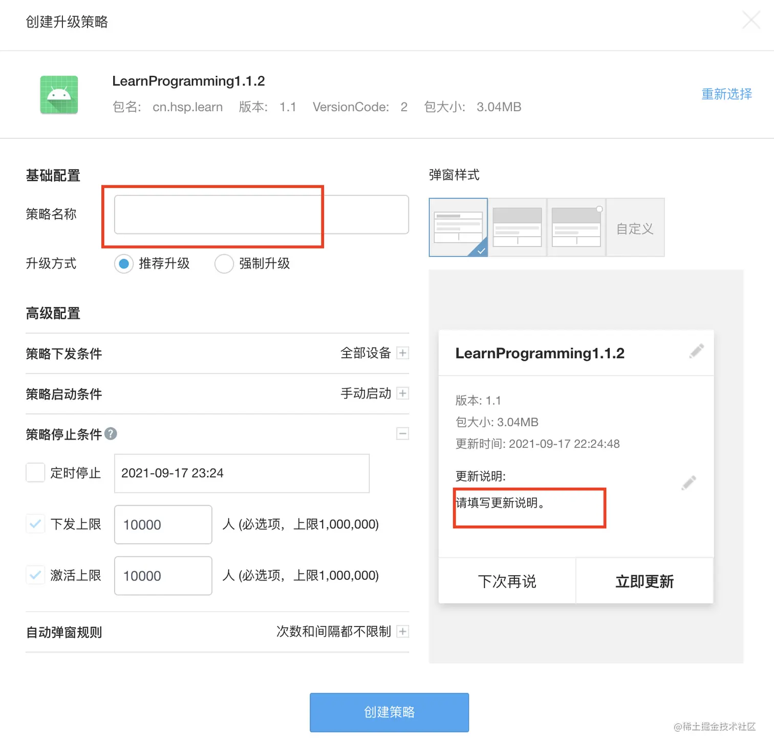6、填写升级策略信息