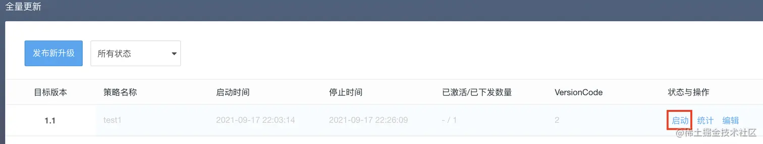 任务创建后,默认是未启动状态,鼠标移到版本信息上,选择“启动”。