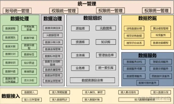 数据中台主要包函:数据统一采集接入平台、数据集中处理平台、数据组织管理平台、数据组织管理平台、数据全域治理平台、数据融合共享平台、数据分析挖掘平台、知识图谱平台、统一管理平台、数据可视化平台等多个平台系统。
