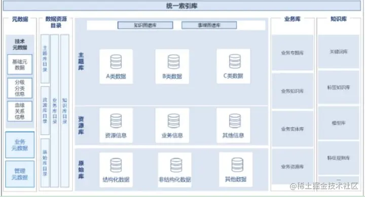 数据中台数据架构是针对多源异构的数据场景,在数据组织层面为数据的接入、融合及智能数据应用服务等提供稳定、高效的支撑。从数据的接入方式、存储方式、加工方式、使用方式等方面综合考虑,资源库是在原始库的基础上进行数据的规范化治理及基于数据主题的整合;主题库是以原始数据、资源数据为基础,构件实体关系模型,并在此基础上形成的知识图谱和事理图谱等;业务库是为了支撑不同业务场景所定义的相关数据结构。知识库是专业领域或与专业领域相关的特征知识数据和规则方法集合。此外还包括整合数据索引信息的统一索引库;记录了本平台及与平台相关的数据的属性、位置、数据量、权限等基本信息的数据资源目录;记录了技术元数据、业务元数据、管理元数据的元数据库;以及为交互分析挖掘规划的数据实验空间和记录平台相关管理配置信息的管理信息库。数据架构图如下: