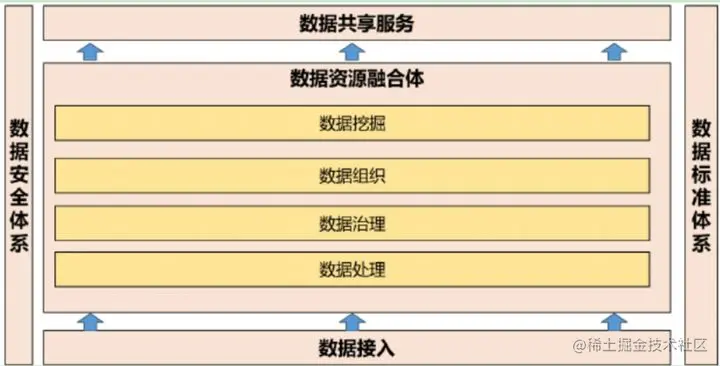 基于数据资源的需求分析和愿景目标,结合设计规划方法论、原则和规划思路,统一数据资源体系规划建设大数据采集感知体系、数据资源融合体系和信息共享服务体系,将数据安全和数据标准融入三大体系之中,通过智能演进不断提升数据接入、处理、组织、挖掘、治理和服务的能力,不断丰富和完善数据中台。数据资源总体架构图