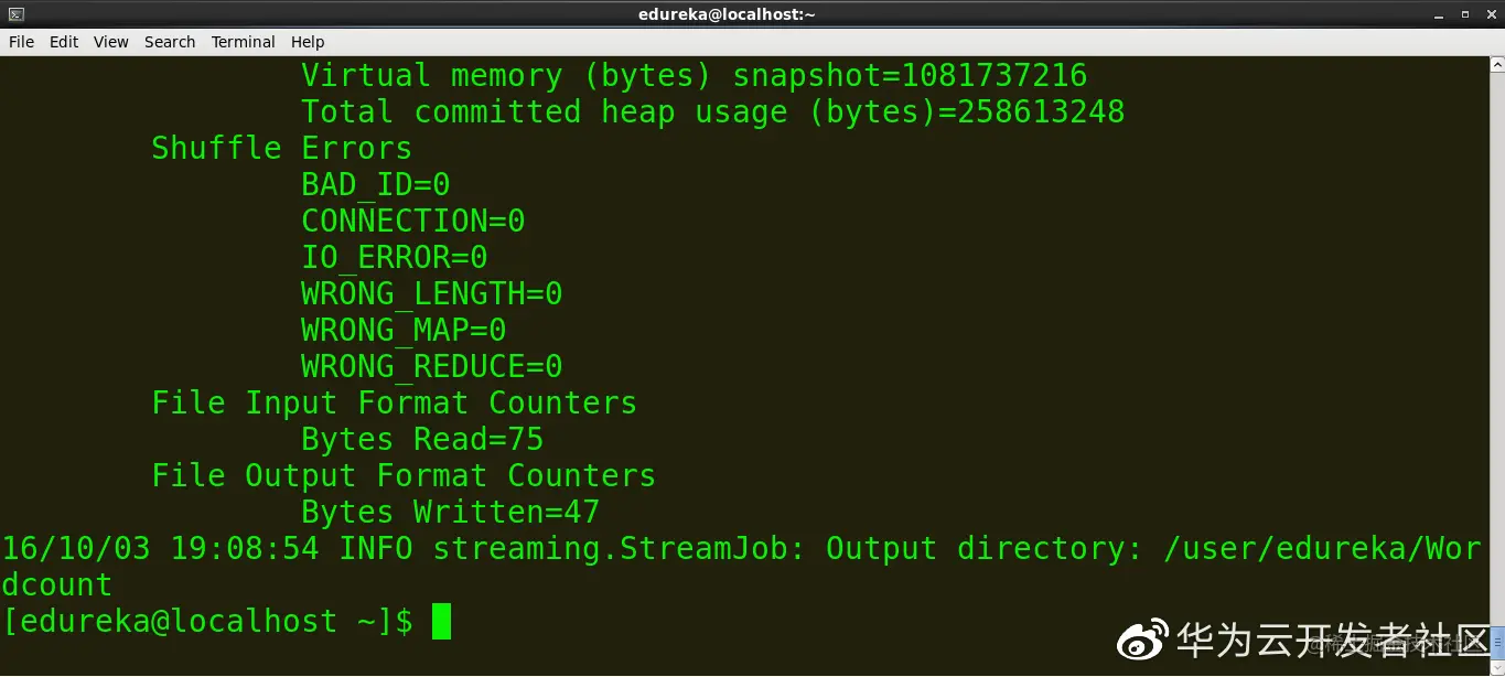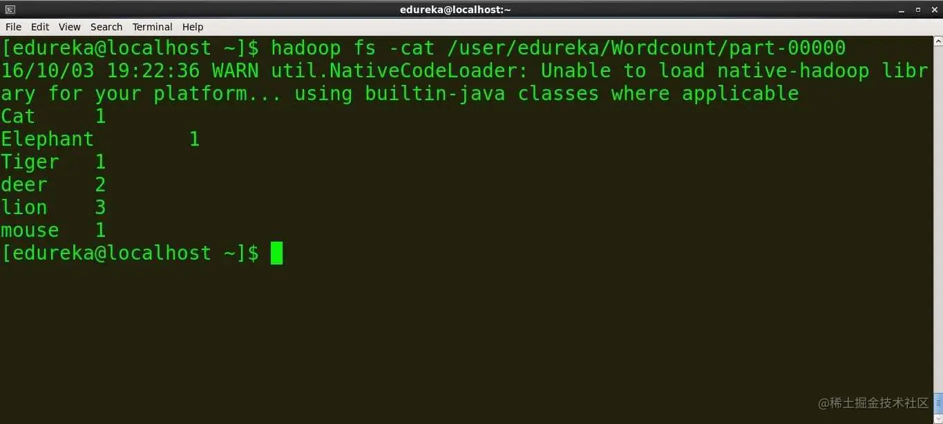 命令:hadoopfs -cat /user/edureka/Wordcount/part-00000