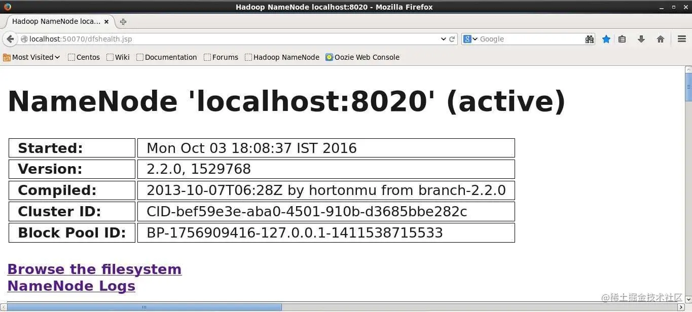 Hadoop 为统计和信息提供了一个基本的 Web 界面。当Hadoop 集群运行时,在浏览器中打开http://localhost:50070。这是Hadoop Web 界面的屏幕截图。