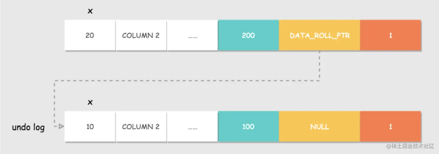 - DATA_ROLL_PTR:指向该行回滚段的指针。该行记录上所有旧版本,在