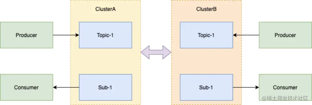 Broker 跨机房。多数据中心之间地位均等。正常模式下,多数据中心协同工作,并行为业务提供访问服务,充分利用资源。一个数据中心发生故障或灾难,其他数据中心正常运行,立即对关键业务或者全部业务实现接管,达到互备效果,使上层业务不会有明显的感知。