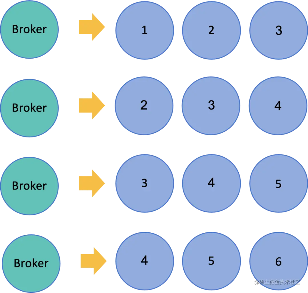 - 第四条消息,Broker 会同时写入 Bookie4、Bookie5、Bookie6。