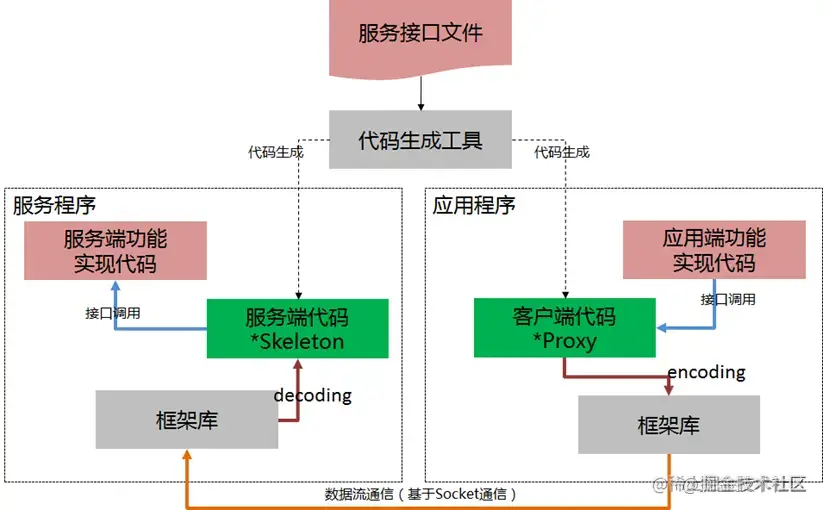 该图中描述了一个接口的调用过程, 应用端发起调用, Proxy将函数调用encoding成数据流, 发送到服务端,服务端接收后,decoding成函数调用,服务端触发其执行代码,这样就完成一次函数的调用。我们可以先简单讨论到这里,下文我们可以再详细讨论一下该过程。
