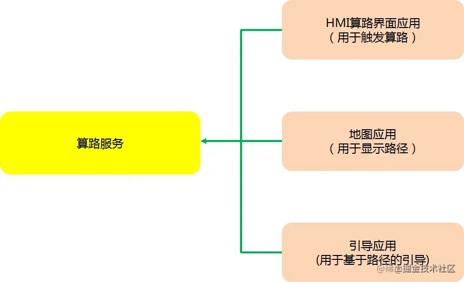 首先我们还是基于一个应用场景来定义服务。譬如以导航为例, 可以把计算一条路径的模块定义成一个服务。原因很简单,算路过程里面的实现还是蛮复杂的,里面会用到若干算法,通过把算路定义成服务,可以很好的把算路过程分离出来,很多基于算路的应用,譬如HMI等可以独立于算路模块,单独进行设计,这样可以达到模块解耦的目的。如下图所示: