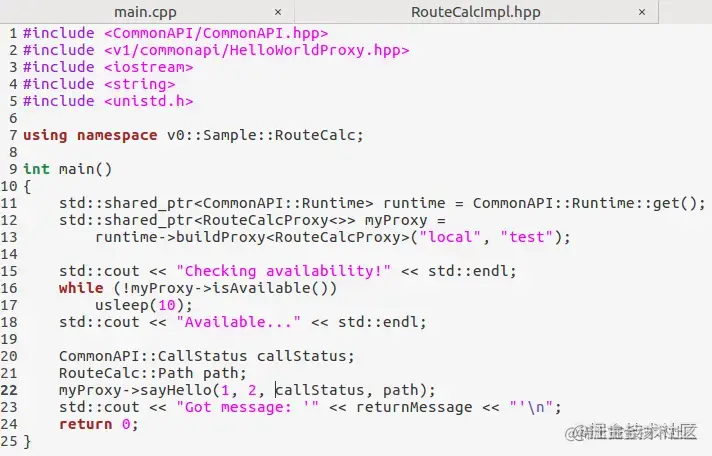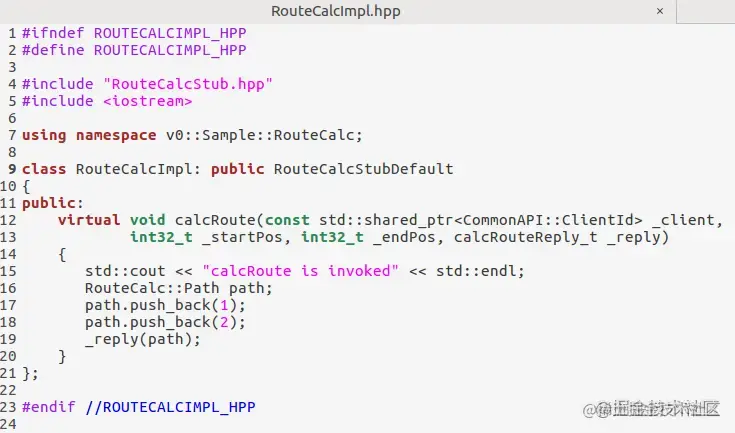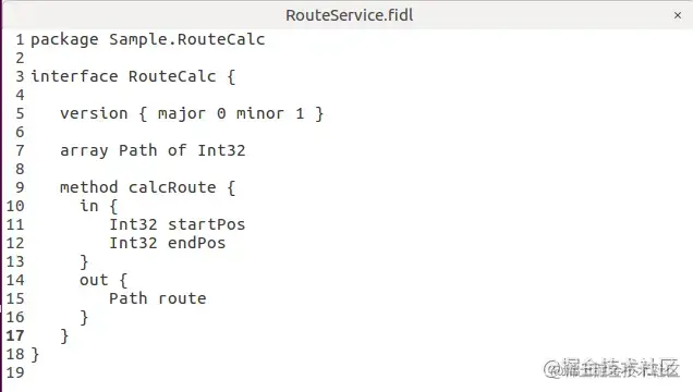 对于上述场景中的算路服务,我们假设该服务中提供一个算路接口,譬如叫CalcRoute,该接口由2个输入参数(一个是起点道路ID,一个是终点道路ID),1个输出参数(算路结果,由多条道路组成的一个list)。这里仅仅是一个示例,实际场景会复杂许多。那么基于CommonAPI框架定义的接口文件为如下形式: