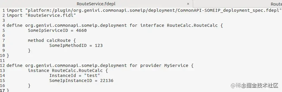 那么该method会对应SOME/IP消息格式里的method么?如果是的,那么method的id是多少呢?这里我们就得引入一个新的文件,fdepl文件, Franca创建专门的语言用于描述该文件,该文件定义服务接口与SOME/IP的对应关系,如下图所示: