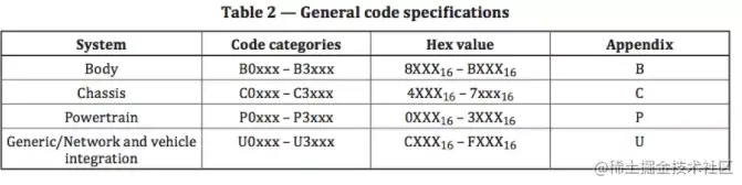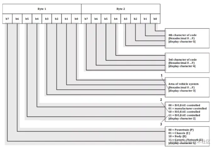 正如我们经常在客户诊断调查表见到的P(00)、C(01)、B(10)、U(11)来实现我们所说的DTC诊断显示码(PBCU开头码)与日常使用的3字节DTC转换 关系,实际上只需要将PBCU四个子系统对应的bit组合关系替换进去,便可以得到我们常说的DTC,这点很多小伙伴可能都会有误区,特此说明一下。
