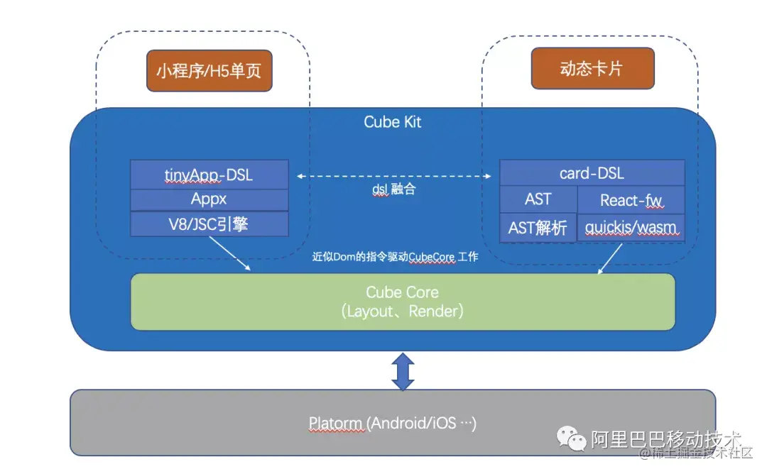 对于Cube小程序,支持tinyApp-dsl子集,移动端上使用jscore/v8作为js代码的执行引擎,IoT设备上使用quickjs;对于Cube卡片,支持基于精简vue的card-dsl。简单的卡片直接解析AST来渲染页面,复杂卡片支持用户用js写一些简单逻辑,并且通过quckjs来驱动dom树的更新。