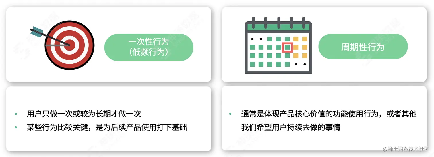 周期性行为:我们希望用户尽可能多次发生某个行为,或者发生的程度更深,通常是体现产品核心价值的行为,常见如支付订单、浏览内容等等。这类问题通常对应的业务目标是“参与度”或“留存”,即让用户更多更深入地做某件事情。