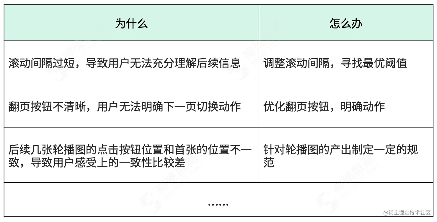 当定位到某个问题页面或者模块之后,我们会进一步列出为什么和怎么办。比如我们在数据分析中诊断出某电商的轮播图模块存在转化问题,该模块靠后的几张广告的渗透率急剧下降,且经评估我们认为该模块的重要度比较高,我们就可以进一步针对其列出以下列表: