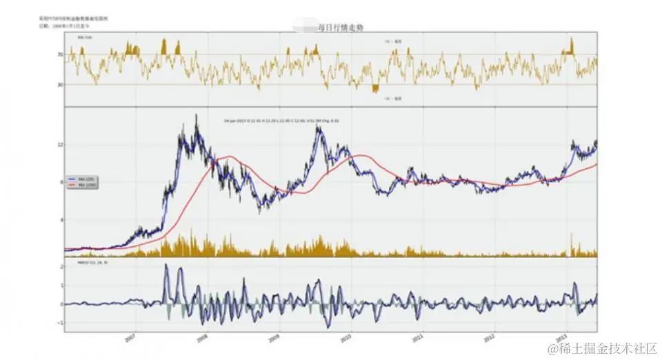 在金融行业,可以用不到200行的代码,根据给出的历史起点日期和股票代码,自动从财经网站里获取直到当日的交易数据并绘制基本走势图、移动平均线、RSI和MACD指标,做出了漂亮的股市分析图。