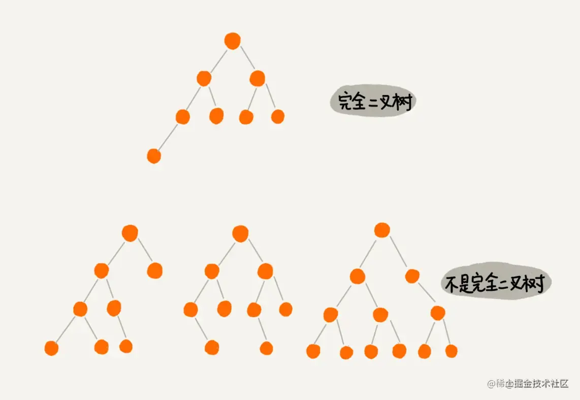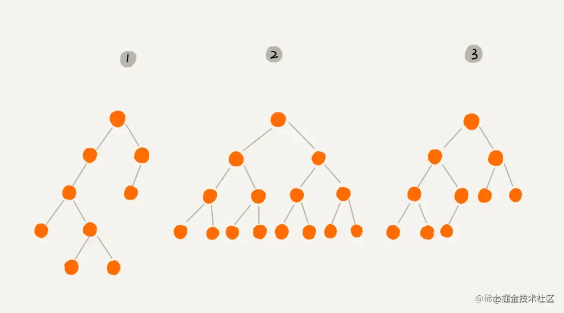 编号 3 的二叉树中,叶子节点都在最底下两层,最后一层的叶子节点都靠左排列,并且除了最后一层,其他层的节点个数都要达到最大,这种二叉树叫做完全二叉树。